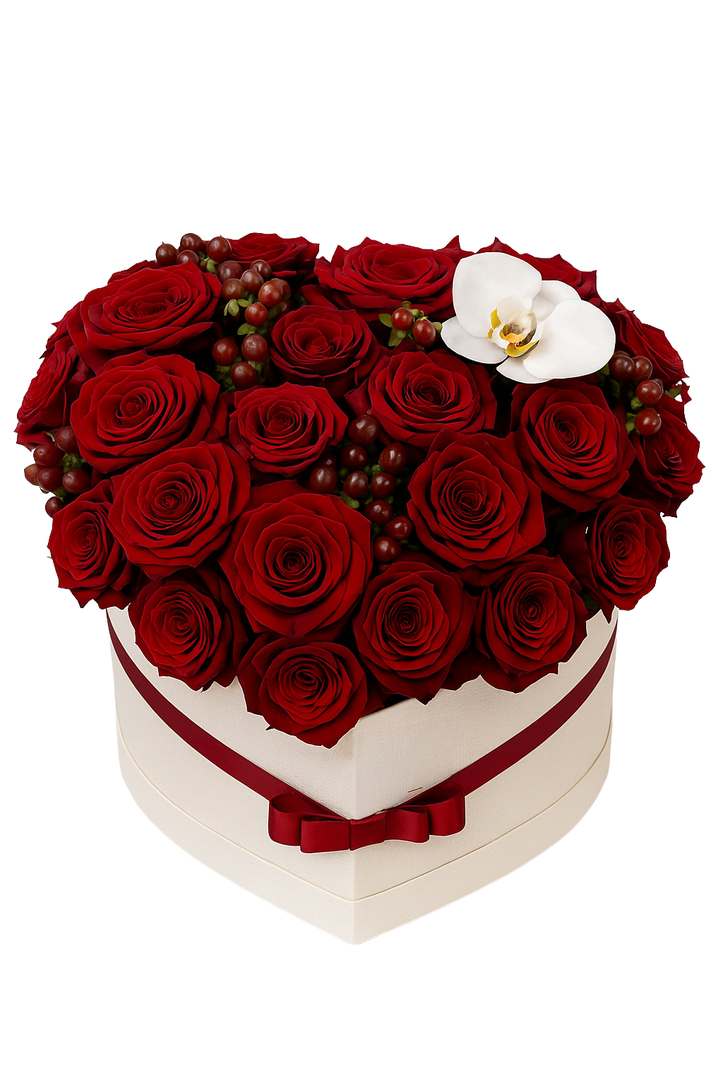 Луксозна кутия във формата на сърце, пълна с кадифени наситеночервени рози, акцентирани от нежни плодове от жълт кантарион и една-единствена девствено бяла орхидея. Тази елегантна аранжировка е перфектният символ на вечна любов и преданост, което я прави незабравим подарък за наистина специален повод.