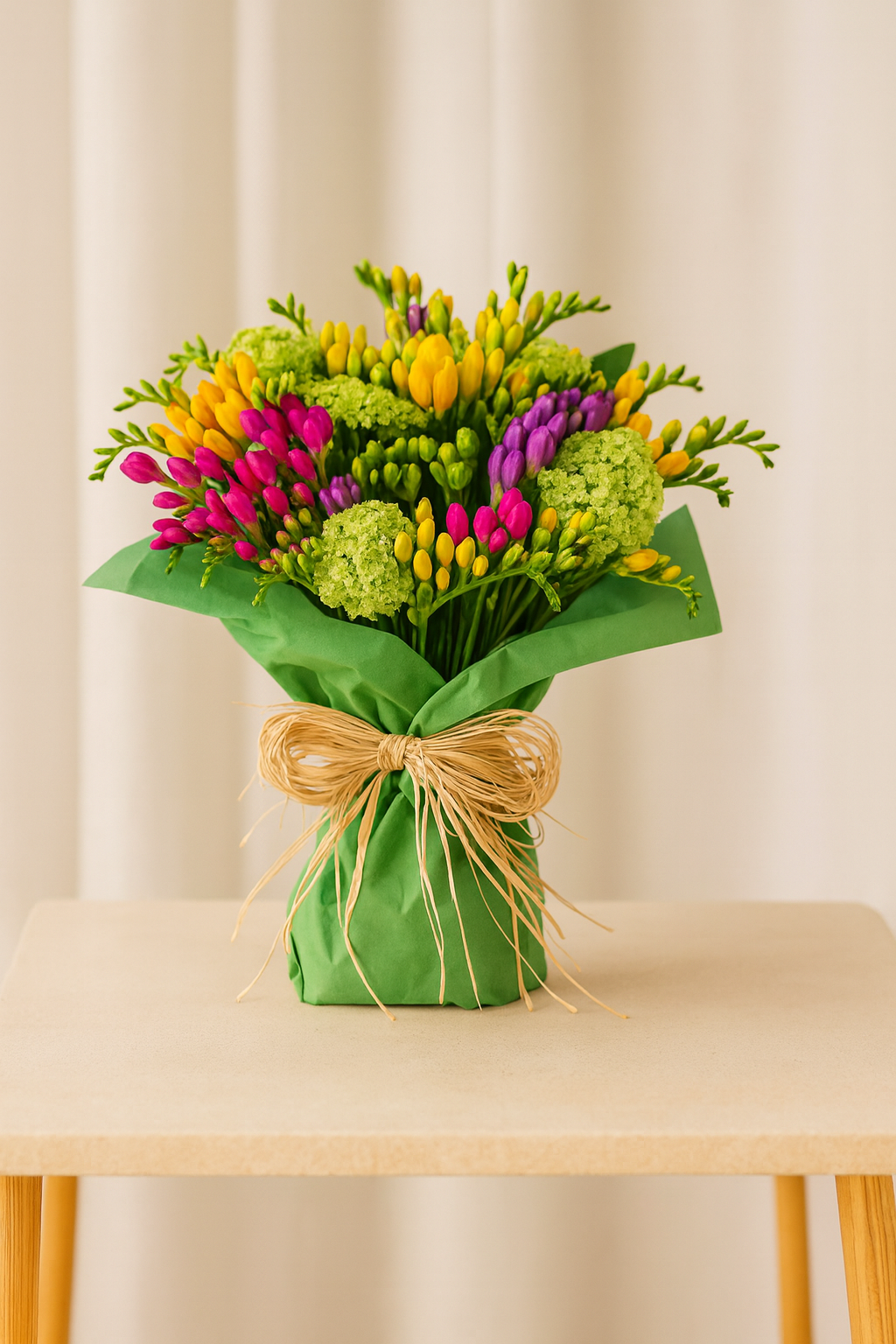 Flower bouquet with forty-five colorful freesia.