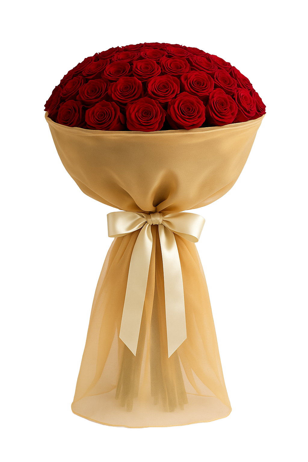 A bouquet that speaks the language of elegance and passion. Golden Kiss features 101 vibrant red roses wrapped in soft golden tulle and tied with a matching satin ribbon. Bold yet refined, this arrangement is perfect for celebrating love, expressing gratitude, or simply making someone feel truly special.