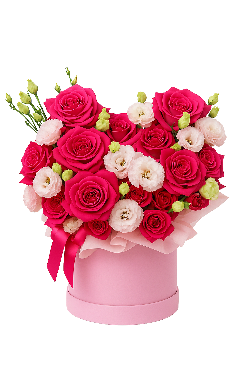 A breathtaking heart-shaped arrangement bursting with vibrant fuchsia roses, soft blush lisianthus, and delicate ivory buds. Presented in an elegant pink velvet box with satin ribbons, this bouquet is the ultimate expression of love, admiration, and heartfelt emotion — perfect for making unforgettable memories.