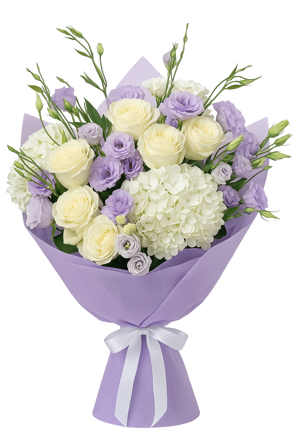 A delicate blend of soft white roses, fluffy hydrangeas, and gentle lavender lisianthus—this bouquet feels like a peaceful breeze on a spring morning. Wrapped in elegant lilac paper and finished with a crisp white ribbon, it’s the perfect choice for expressing calm, gratitude, or simply brightening someone’s day with grace and charm.