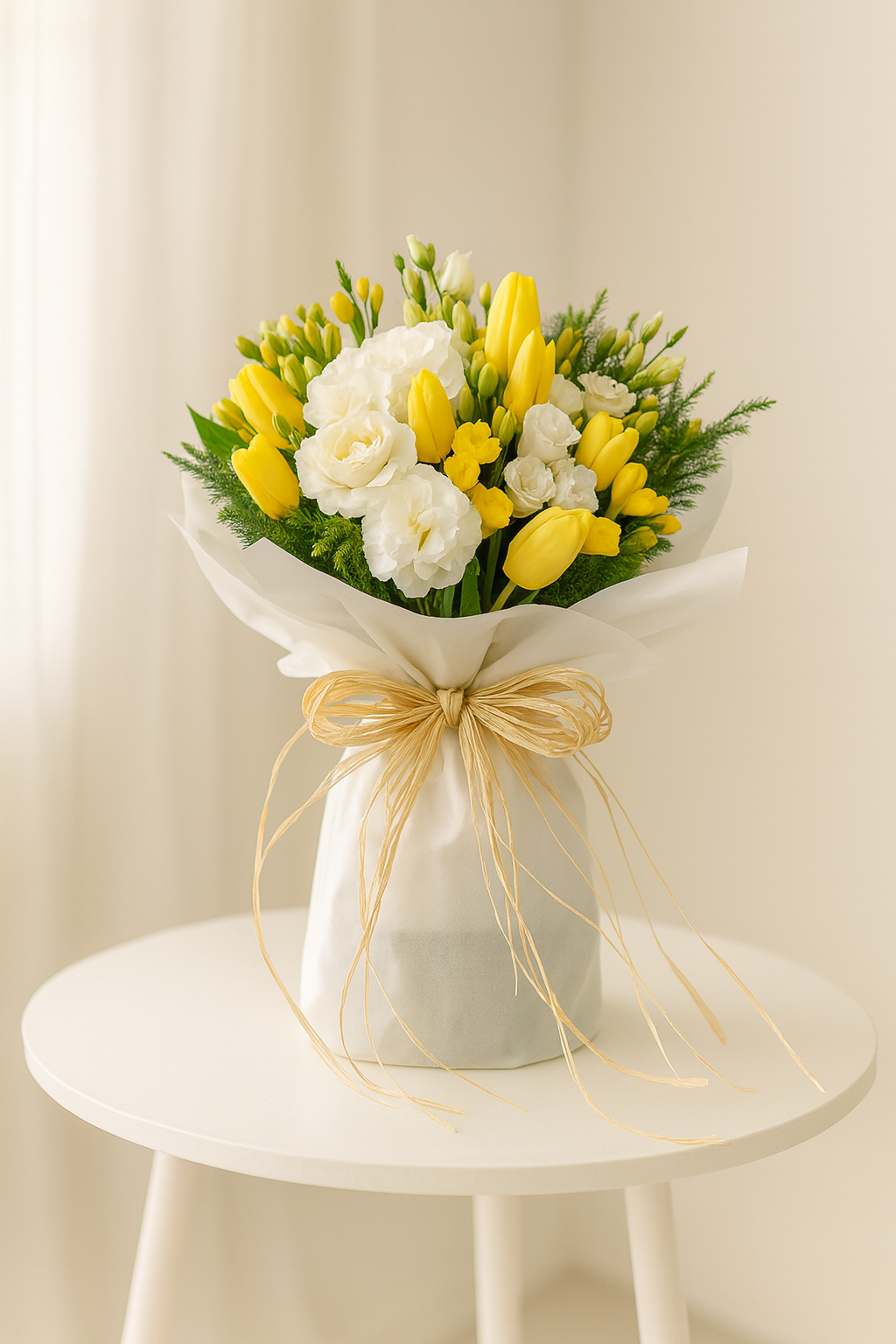 Flower bouquet in white, yellow and green.