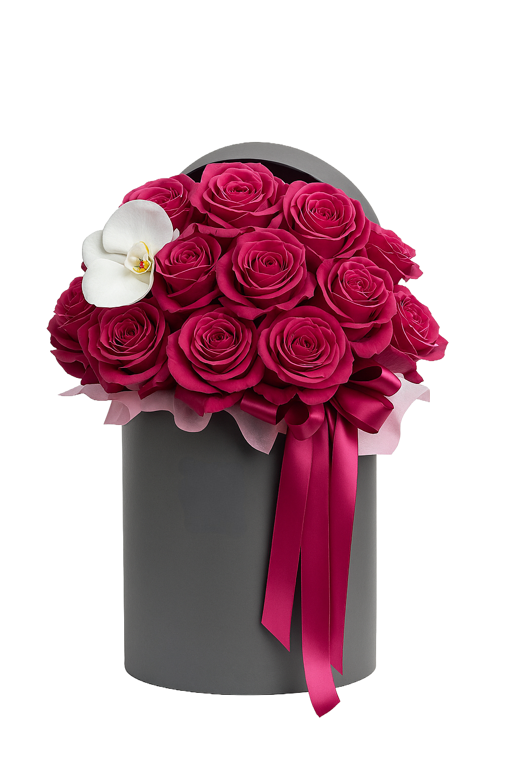 A dramatic arrangement of deep fuchsia roses accented with a single pure white orchid, presented in a sleek charcoal hat box with matching satin ribbons. A luxurious statement of sophistication and passion, perfect for unforgettable moments.