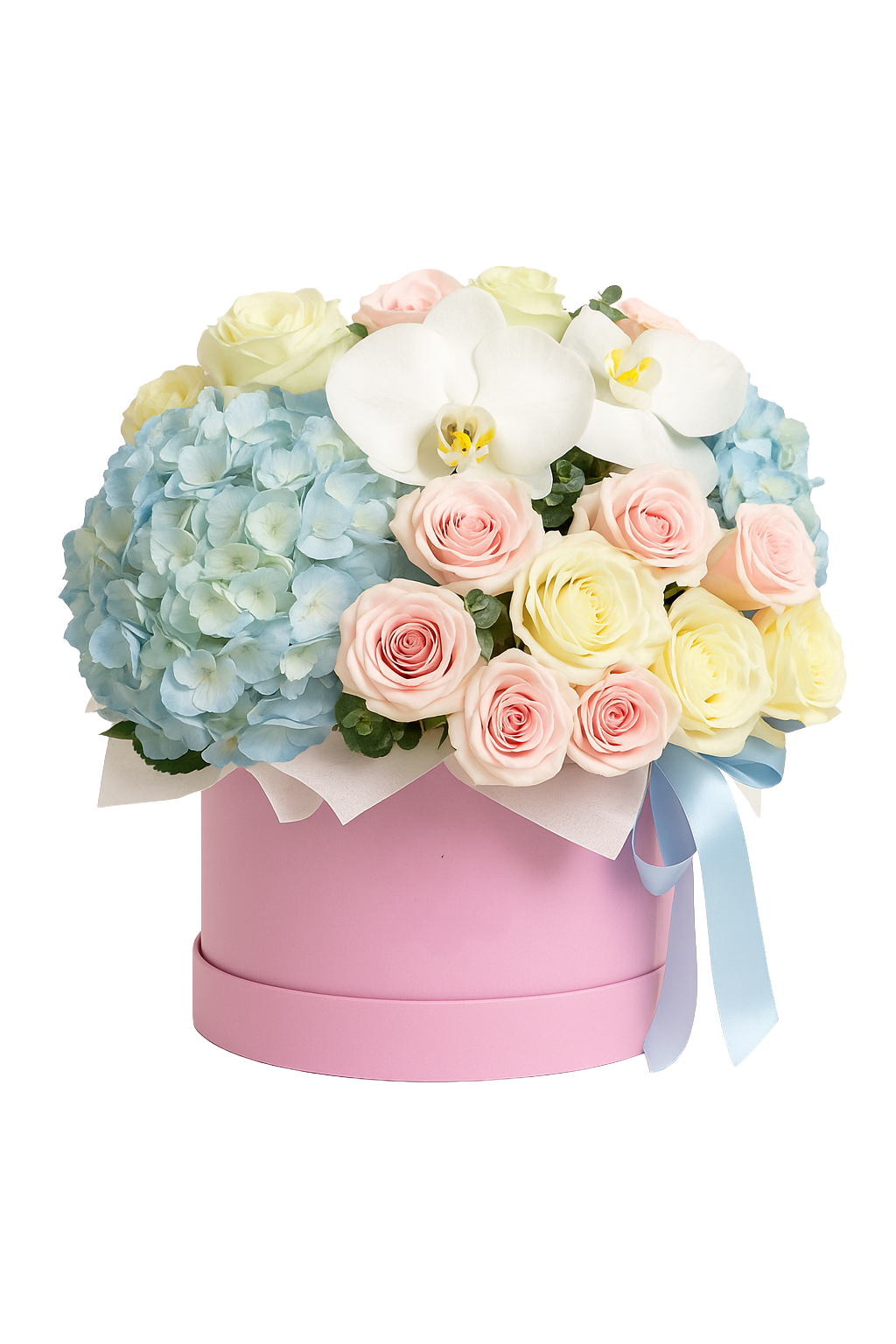 A serene blend of soft blue hydrangeas, blush pink roses, creamy white roses, and elegant white orchids, artfully arranged in a pastel pink velvet box. Accented with a delicate blue satin ribbon, this arrangement exudes calm elegance, making it a perfect gift for expressing grace, admiration, and heartfelt wishes.