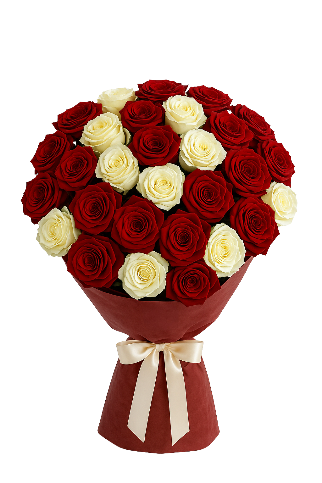 Classic 25 red roses meets creamy white in this bold and elegant bouquet. A stunning mix of passion and purity, it's perfect for romantic gestures, anniversaries, or just saying “you’re unforgettable.” Wrapped in deep red paper and tied with a champagne satin bow, this bouquet is love at first sight.