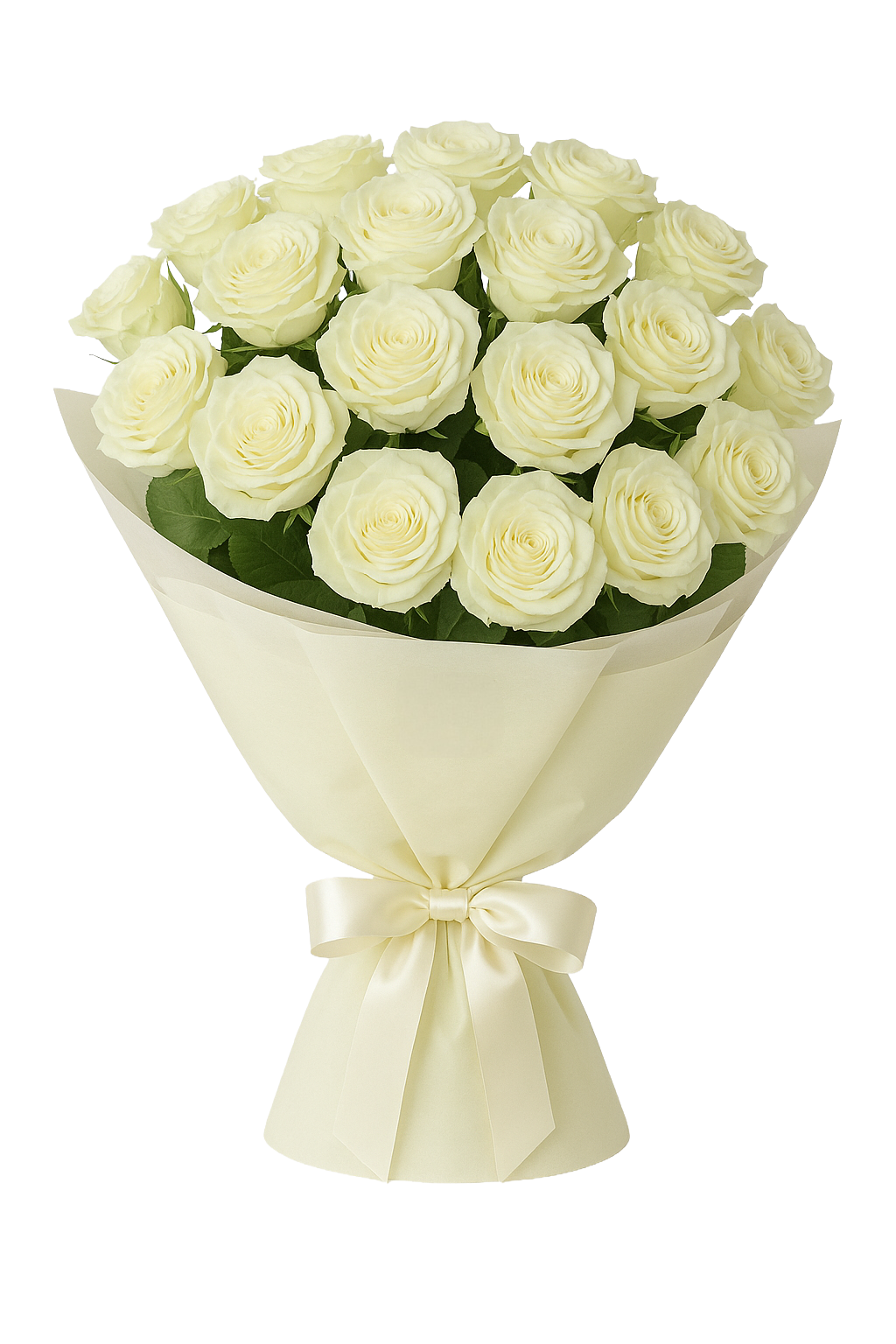 Um buquê suave e gracioso de rosas brancas puras, elegantemente embrulhado em papel marfim cremoso e amarrado com um laço de cetim. Ivory Whisper irradia beleza e serenidade atemporais — perfeito para ocasiões especiais, gestos gentis ou simplesmente para alegrar o dia de alguém com um toque de elegância.