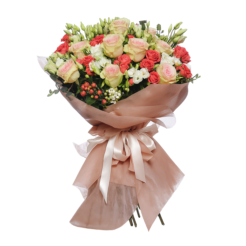 Buquê de flores em rosa, creme e verde.